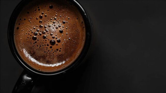 A black mug filled with a concentrated hot beverage, displaying bubbles as it heats up.