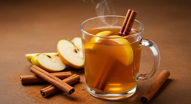 A clear mug of hot apple cider with apple slices and cinnamon sticks on a brown surface, with scattered cinnamon powder and steam rising.