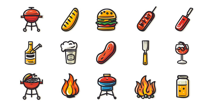Barbecue icon set featuring grill, burger, hot dog, sausage, and drink illustrations, perfect for websites or menus. Vibrant and playful design enhances culinary themes