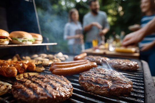 A close-up shot of a barbecue with burgers and hot dogs being grilled for a summer cookout.