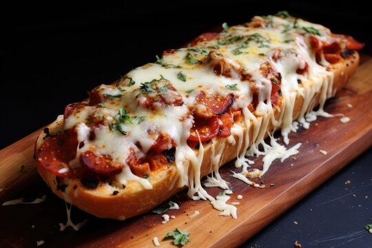 Baked Baguette. French bread pizza on a wooden cutting board