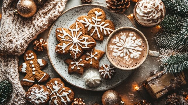 Cozy december moment with smiling woman and warm beverage