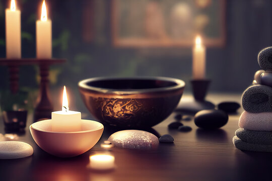 Beautiful atmospheric, spa or massage interior with candles , towels and hot stones