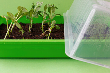 Top view of small pea plants in a green plastic hotbed cultivated at home. Young pea shoots in a home hotbed with a dewy lid. Home cultivation of herbs and vegetables concept, urban home gardening