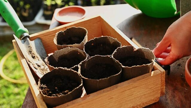 Close-up wooden crate with biodegradable peat pots full of fertilized black soil and farmer hands, sowing tomato seeds at spring planting season. Cultivating organic homegrown vegetables. Eco farming