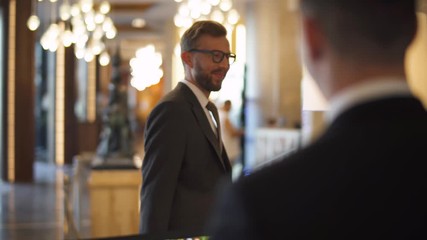 Professional smiling hostess with a tablet warmly welcoming a male guest into a modern luxury restaurant