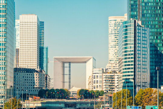Urban skyline with modern skyscrapers at La Defense with the Arch of La Defense and a busy highway under clear blue skies, Paris, France