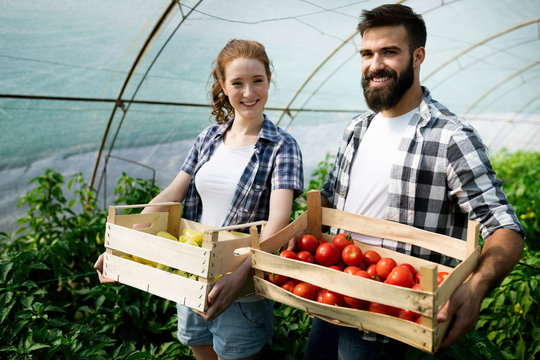 Woman and man in tomato plant at hothouse