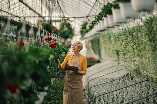 Happy old florist with clipboard at hothouse checking on vertical garden