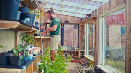 Happy male Gardener Waters Plants and Flowers with a Hosepipe in Sunny Industrial Greenhouse.