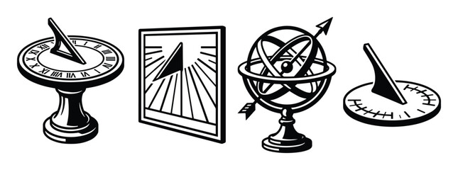 Collection of various sundial designs. A timekeeping tool with shadow casting gnomon and hour markers.