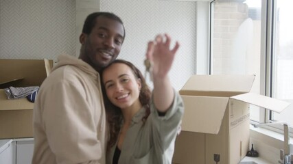 Portrait of young mixed ethnicity couple holding keys to new home standing in kitchen hugging as they unpack removal boxes together - shot in slow motion