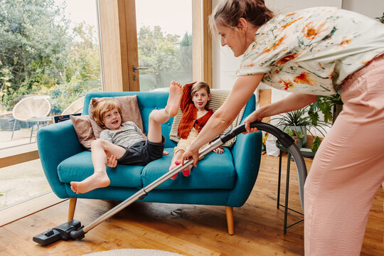 Woman encouraged to clean refrigerator while cooking in contemporary kitchen