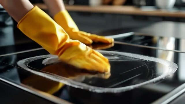 Man in yellow gloves wiping down a glass-ceramic stove, useful for advertising household chemicals and kitchen accessories, as well as for instructional cleaning videos.
