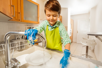 Cropped shot of a person in an apron washing a plate with a sponge under running water in a kitchen sink. Daily household chores and domestic hygiene concept.