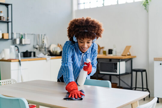 Smiling Afro woman listening music spraying disinfection on dining table in kitchen
