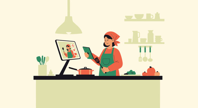 Woman Learning Culinary Arts Online Watching Cooking Tutorials In The Kitchen