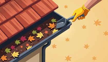 Hand scooping leaves from gutter for fall home maintenance and DIY websites