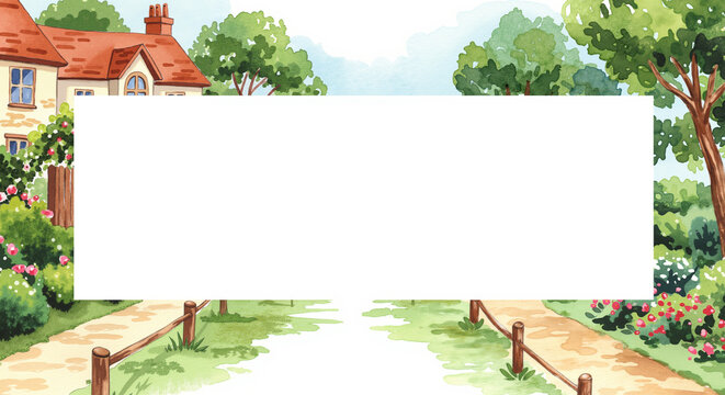 Watercolor landscape of a cottage and garden path in summer, Housewarming card background frame