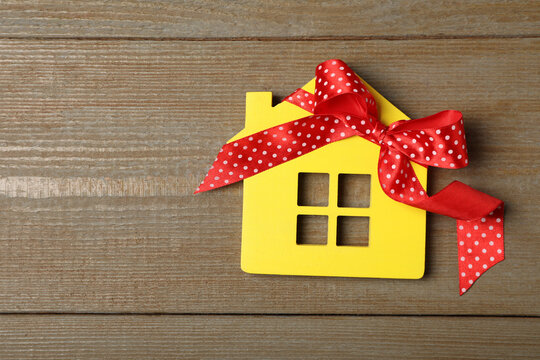 Yellow house model with bow on wooden table, top view and space for text. Housewarming party