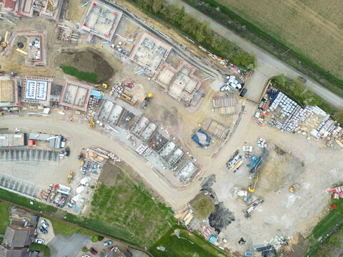 Drone top down view of a rural housing development site in rural Britain. Seen in the early stages of construction with foundations in place for the dwellings.