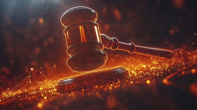 A judge's gavel hovers in a high-tech virtual space, symbolizing the enforcement of cybersecurity laws and regulations in an abstract, futuristic technological environment.