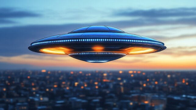 A metal UFO majestically hovers in the sky reflecting sunlight elegantly. Concept Science Fiction, Extraterrestrial Encounters, Alien Technology
