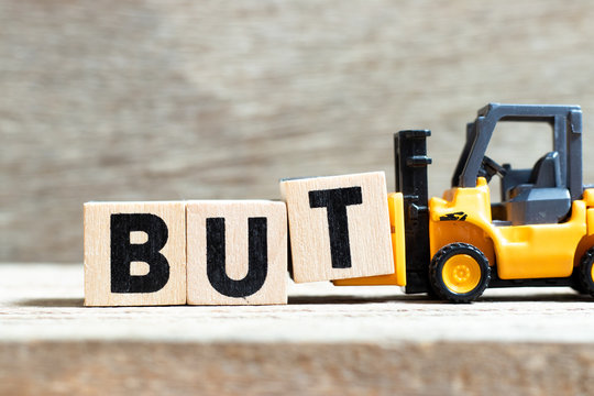 Toy forklift hold letter block t to complete word but on wood background