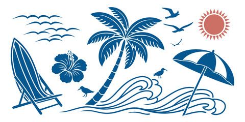 Vector illustration of a tropical summer beach island with palm trees and a beautiful sunset over the ocean waves