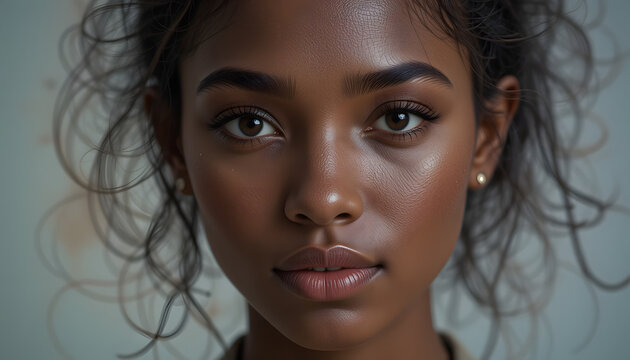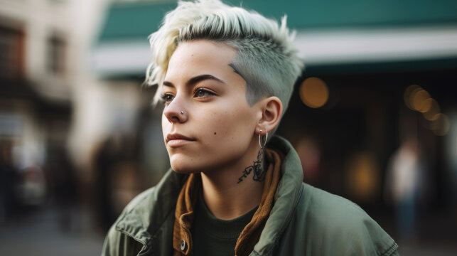 A confident tomboy with short hair styled in a fashion-forward manner, her portrait taken against a clean white background with a hint of faded colors