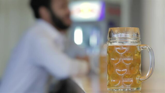 Charismatic good looking smiling large guys cheers with big glasses of beer in a pub they enjoying the time together while drinking at bar table