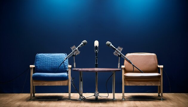behind the scenes empty scene of two chairs and microphones stand in interview or podcast room isolated on dark navy background concept of silence after the hubbub intense preparation of the program