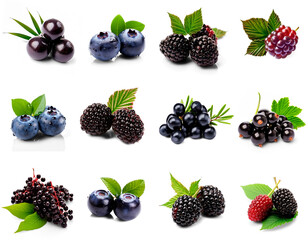 Assorted wild berries isolated on transparent background. Includes acai, boysenberry, juniper, and huckleberry in PNG collection