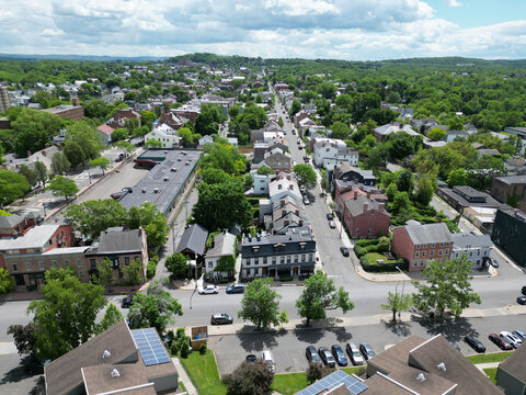 aerial view of hudson, new york (small hudson valley town city downtown historic district) mountains catskills ny travel destination main street with hills clouds cars tree matter