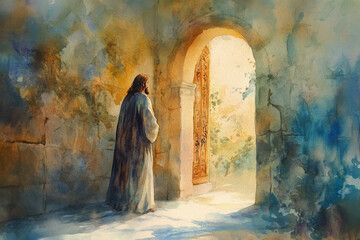 Jesus standing by a door, with light streaming in from behind him. The watercolor uses soft golden hues and gentle blues, symbolizing the divine invitation to enter and receive peace.