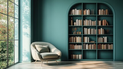 In a serene room painted in the calming hues of teal, a minimalist bookshelf, its sleek lines adorned with a few carefully chosen books, stands as a silent invitation to creativity and contemplation
