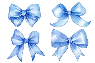 An illustration of four blue watercolor bowknots, rendered in soft hues against a plain white background.