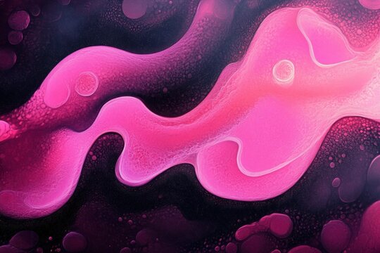 Abstract flowing liquid shapes in vibrant pink hues with gradient textures against a dark purple and black background conveying fluidity and softness