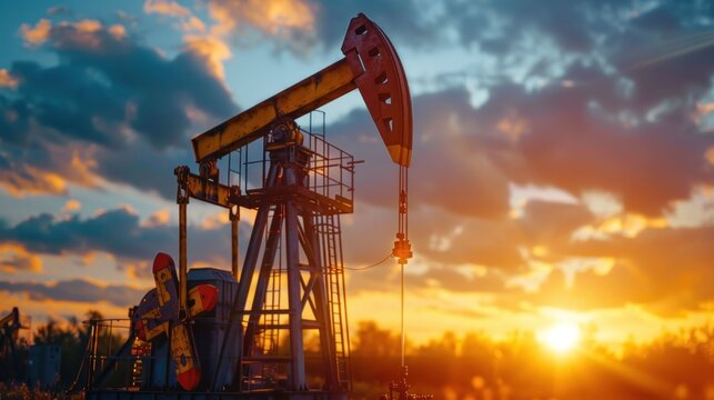 Oil pump jack silhouette against a vibrant sunset sky with dramatic clouds in warm hues of orange and blue