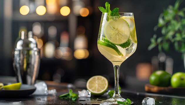 cocktail hugo or mojito with mint, lime and ice in wineglass on black background