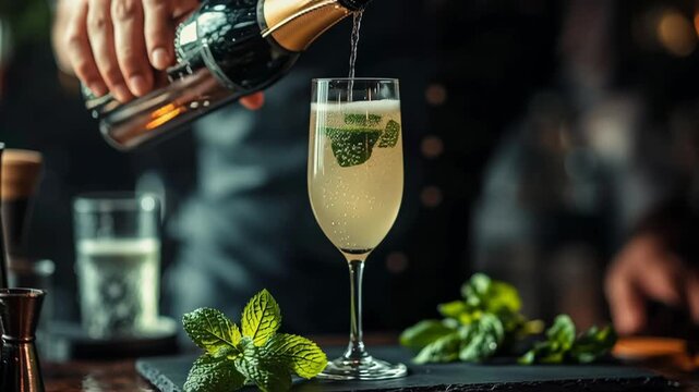 Bartender pouring elderflower liqueur into glass with mint leaves - Concept of Hugo Spritz