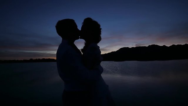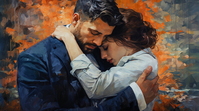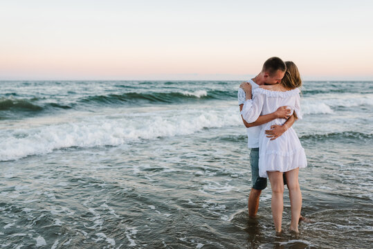 Young couple in love spends time together. Man embracing and going to kiss sensual woman.