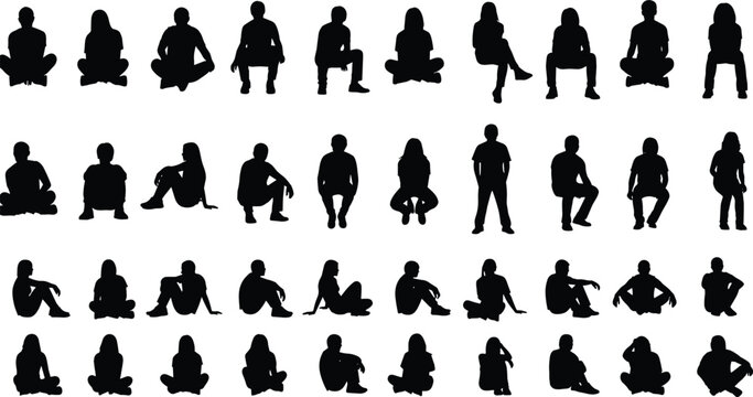 People sitting silhouettes in different relaxed poses isolated on white background, human posture collection, casual lifestyle, design reference illustration set