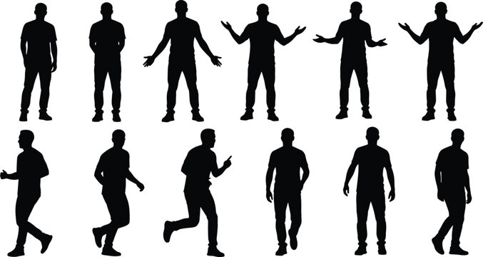 Vector illustration of human silhouette poses—symbols for walking, standing, gesture, motion, lifestyle, posture, character design, and animation reference graphics