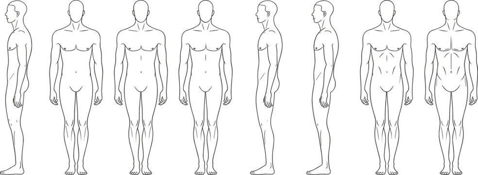 Vector line art set of human male body anatomy standing poses showing front and side views for character design reference and medical study diagrams.