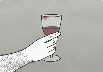 Cropped image of man holding wineglass with lipstick kiss against gray background