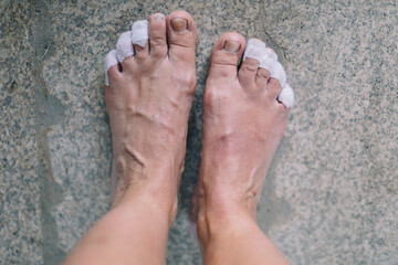 A hiker wraps her toes from blisters from the Camino Portugues.