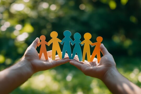 Community support and family unity concept. Social inclusion and diversity representation. Paper chain people holding hands in a circle on green grass during sunset