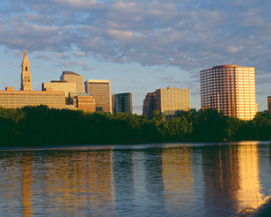 People rowing on the Colorado River and downtown city skyline of Austin at sunrise. Texas, United States.