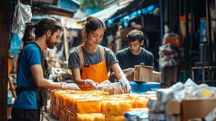 Group of Volunteers Preparing Free Food Rations for Poor People in Need. Charity Workers and Members of the Community Work Together. Concept of Giving and Humanitarian Aid. Close Up Footage.